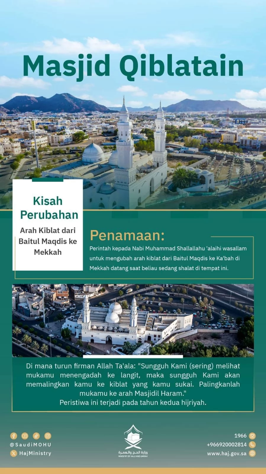 Masjid Qiblatain, yang terletak di Madinah, Arab Saudi, memiliki sejarah yang sangat penting dalam Islam. Masjid ini dikenal karena peristiwa perubahan arah kiblat dari Masjid Al-Aqsa di Yerusalem ke Ka'bah di Mekah. Berikut adalah ringkasan sejarah Masjid Qiblatain: